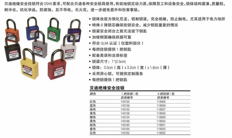 掛鎖是OSHA規(guī)定的上鎖掛牌過程中不可缺少的產品,配合安全鎖具和吊牌完成整個上鎖掛牌活動。掛鎖的作用在于確保在維修維護活動中,工人不會在無意間打開一臺其他人正在使用的設備。而貝迪可為您提供多種選擇,高品質的安全掛鎖,銅鎖,鋼鎖以及鋁鎖可滿足不同應用場所的需要。